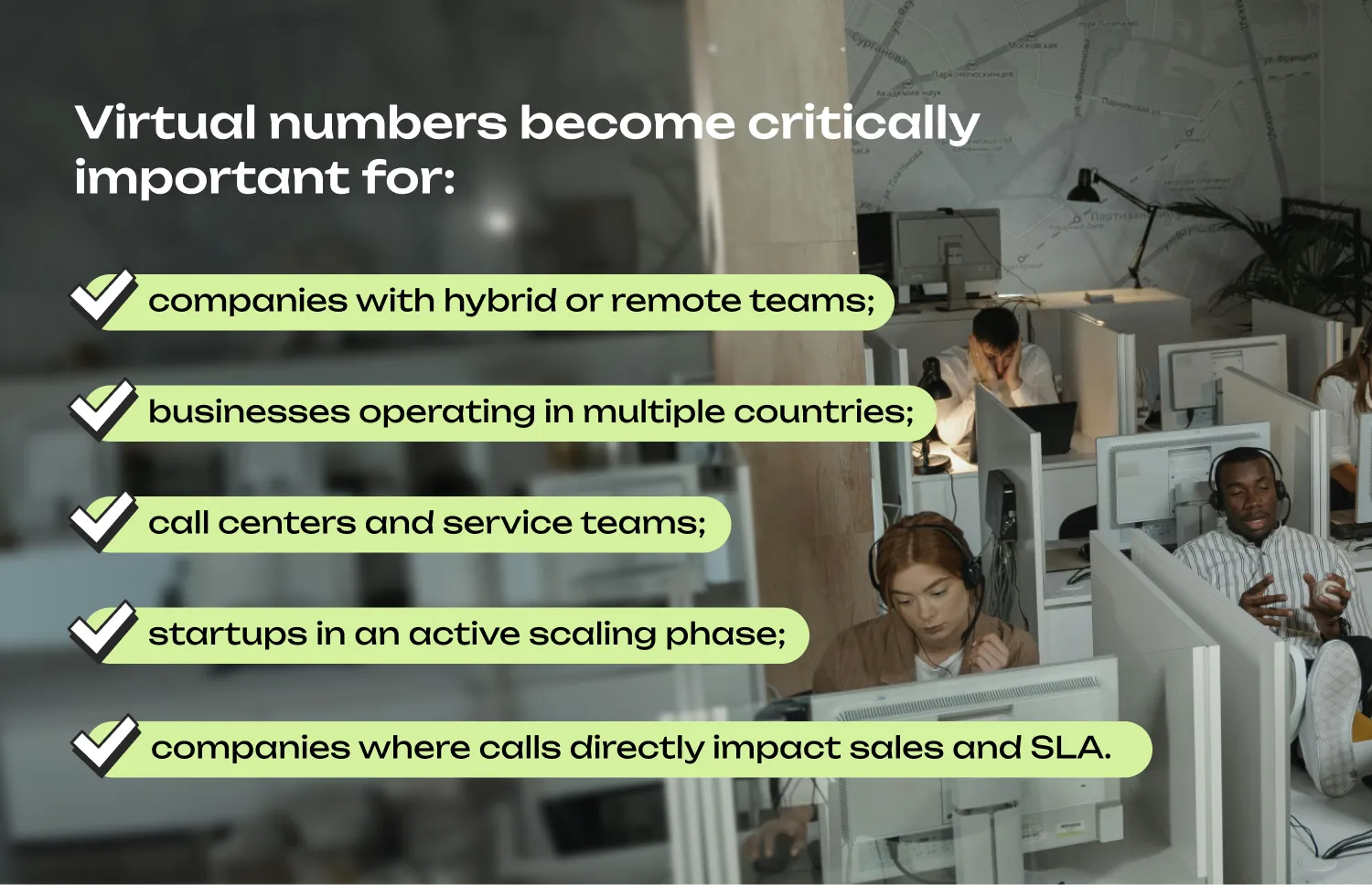 This explains why, according to industry analytics, switching to VoIP and virtual numbers allows businesses to reduce telephony costs by 50–75% by eliminating inefficient infrastructure rather than lowering tariffs.