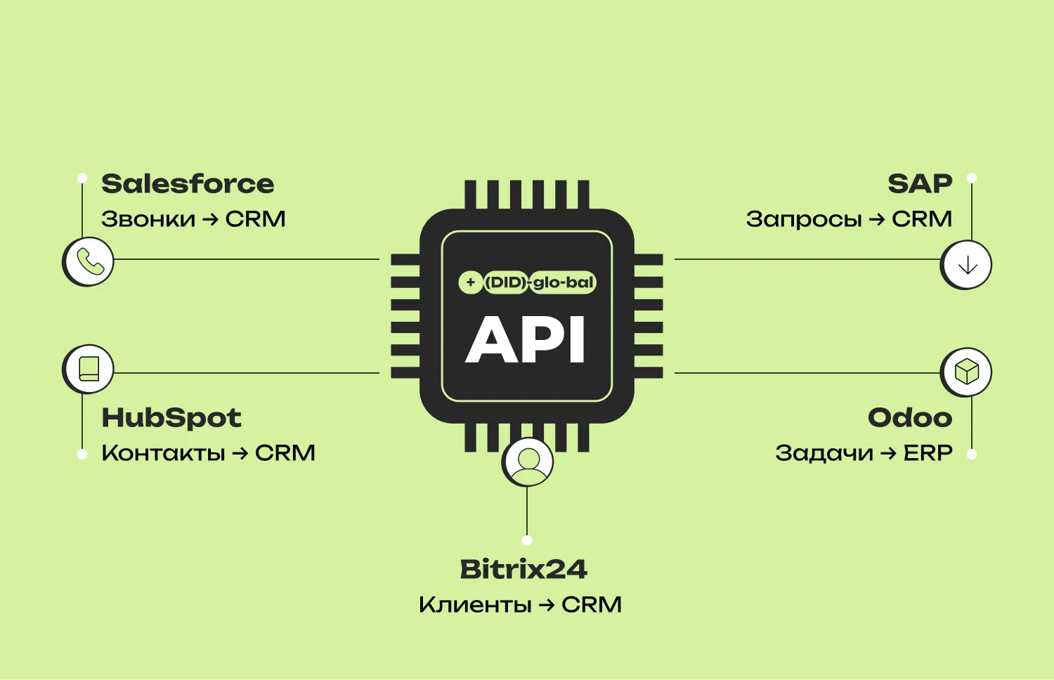 API DID Global создает связь между телефонной инфраструктурой и бизнес-платформами – от Salesforce и HubSpot до SAP и Odoo.