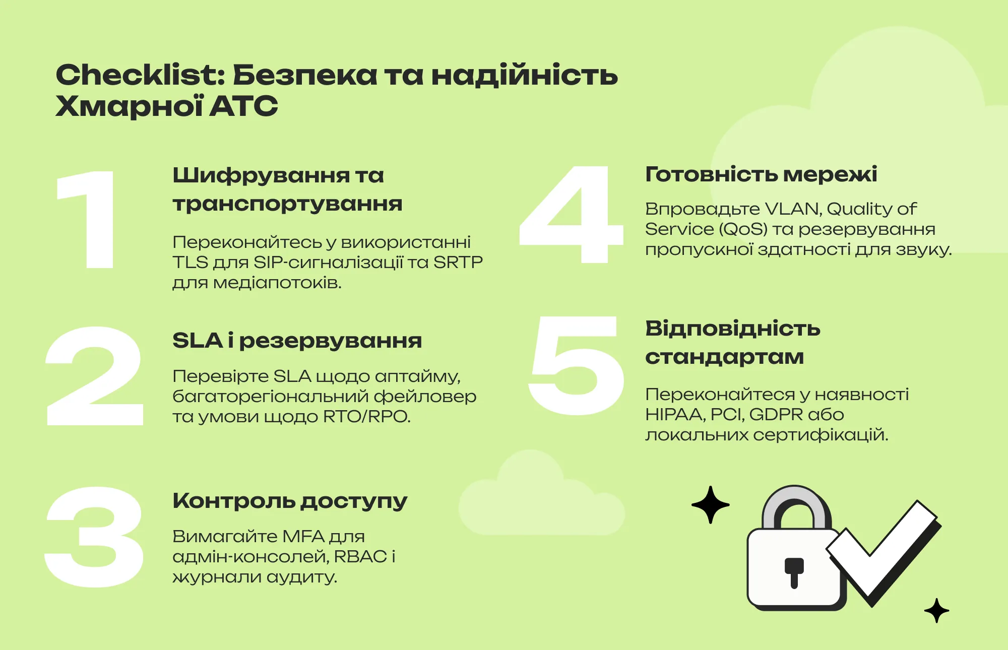 Безпека часто є головним питанням при перенесенні телефонії у хмару. Надійні постачальники використовують TLS і SRTP для шифрування сигналізації та медіа, рольові моделі доступу, захищені API, DDoS-захист і сертифіковані дата-центри (SOC). Якісні провайдери публікують SLA і використовують гео-резервування для забезпечення безперервності. Водночас клієнти залишаються відповідальними за захищені кінцеві пристрої, сильні політики адміністрування та мережевий Quality of Service (QoS) для збереження якості звуку. Обов’язково ознайомтеся з whitepapers постачальників і стандартами шифрування перед укладанням контрактів.