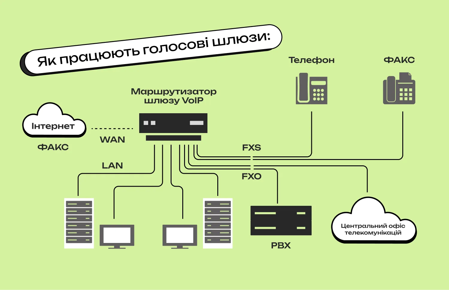 Голосовий шлюз, або VoIP шлюз – це пристрій, який підключається до аналогового телефонного обладнання та перетворює аналогові мережеві комунікації на пакети даних для IP-телефонії. Завдяки такому IP шлюзу, ви зможете використовувати IP протоколи для дзвінків без використання додаткового IP-телефонного обладнання.